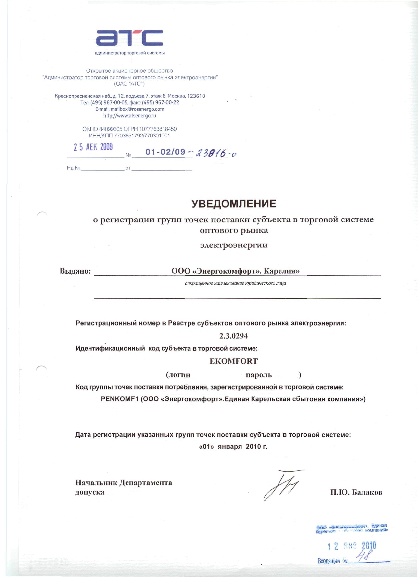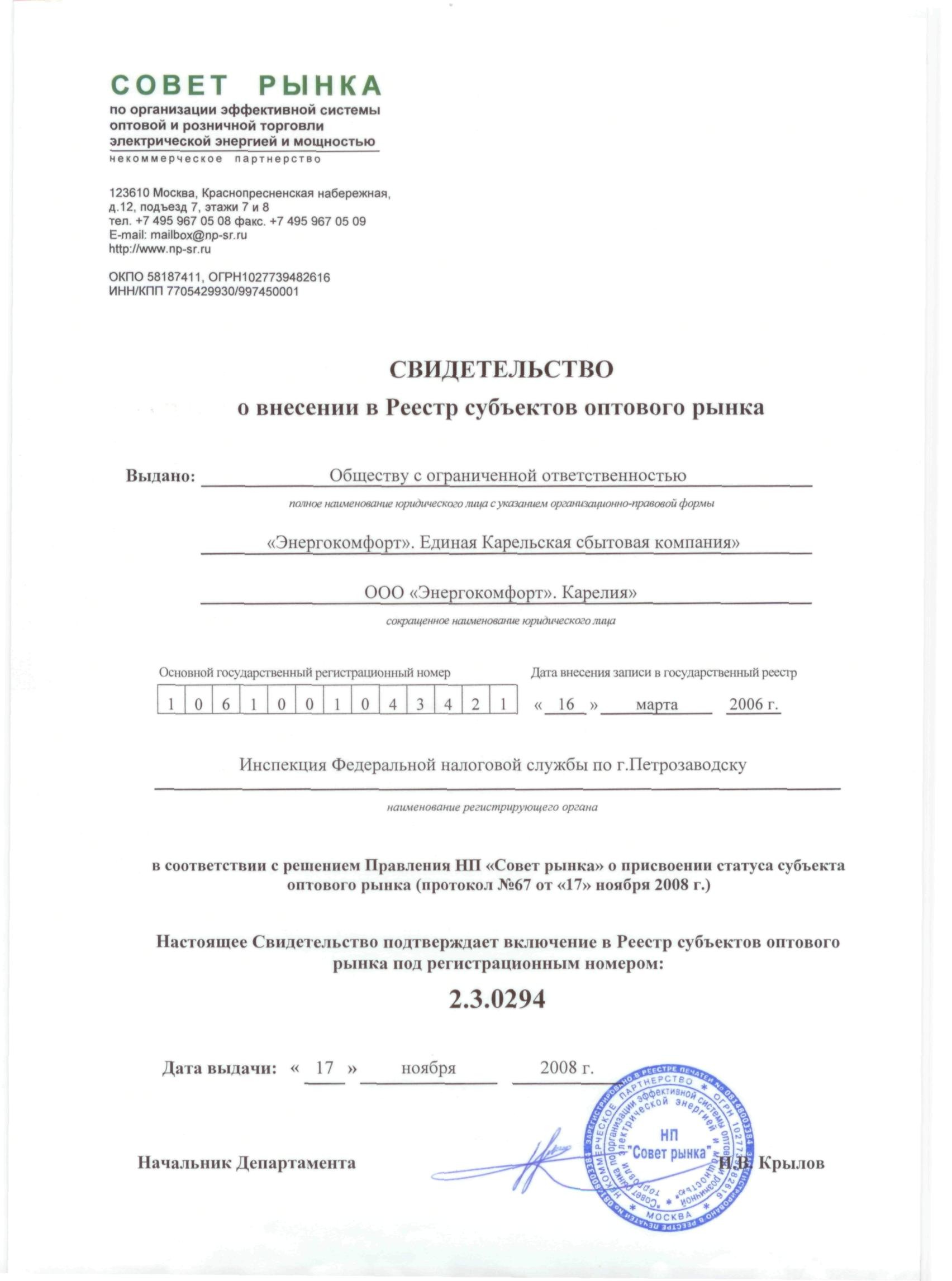 17 ноября 2008 года в соответствии с решением Правления Некоммерческого Партнерства «Совет рынка» о присвоении статуса субъекта оптового рынка ООО «Энергокомфорт». Карелия» внесено в Реестр субъектов оптового рынка за номером 2.3.0294.