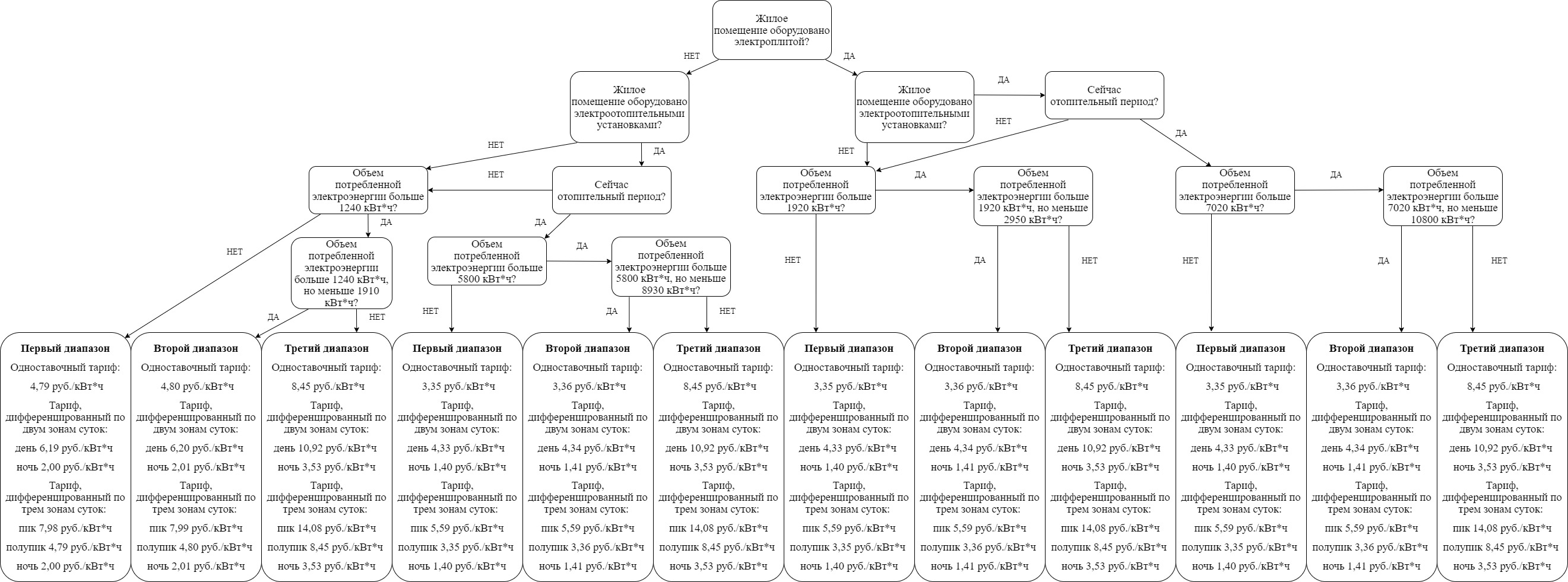 В соответствии с Постановлением Государственного комитета Республики Карелия по ценам и тарифам от 29.11.2024 г. № 167 (в редакции Постановления Государственного комитета Республики Карелия по ценам и тарифам от 28.02.2025 г. № 18) выделяется три диапазона потребления для каждой категории потребителей в зависимости от объема потребления электрической энергии, а также с учетом отопительного сезона. Наглядно увидеть действующие диапазоны потребления и применяемые к ним тарифы можно на схеме: второе полугодие 2025г., первое полугодие 2025г.